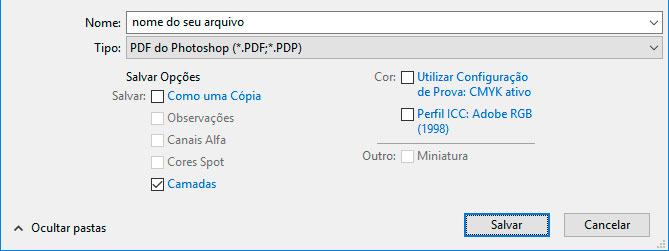 Informe o nome para o seu arquivo e escolha Tipo PDF do Photoshop e clique em Salvar.